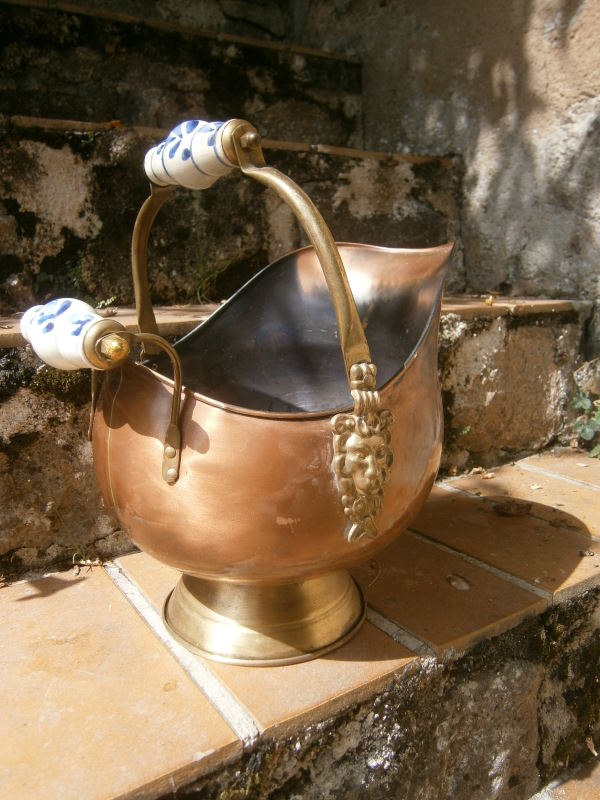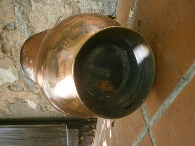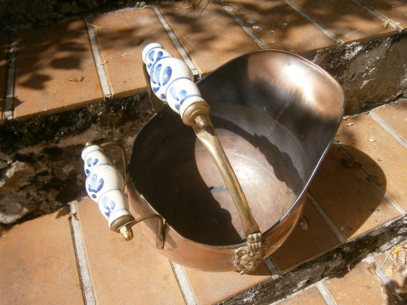 медный зольник из красной меди. Основание и ручка латунные с фаянсовыми частями, место крепления ручки и корпуса украшены